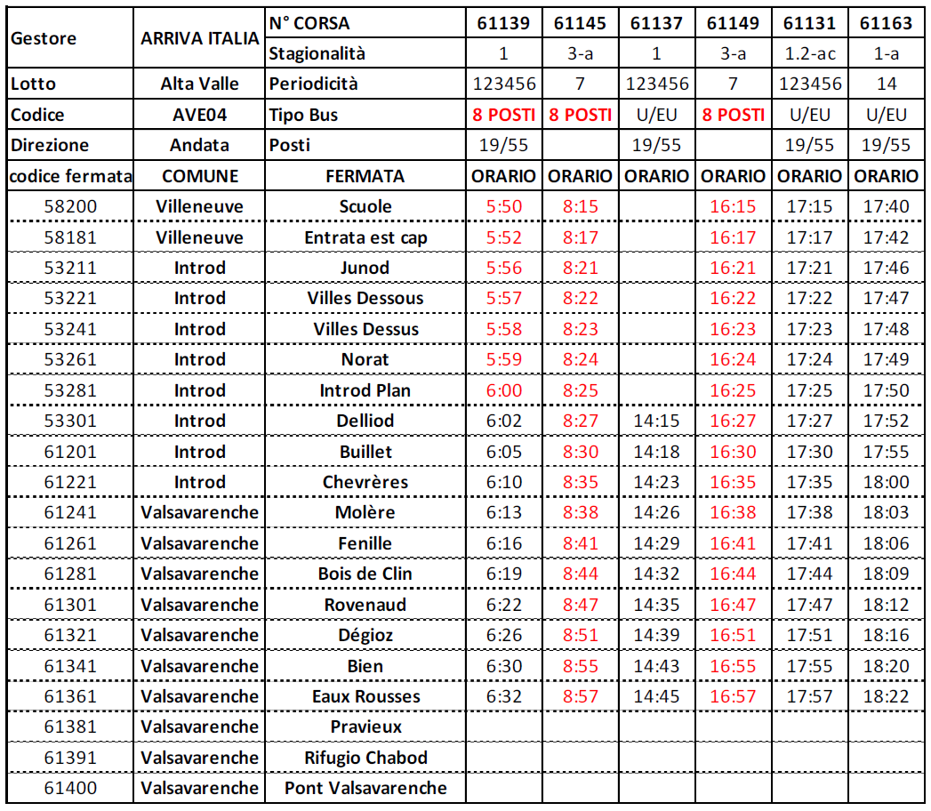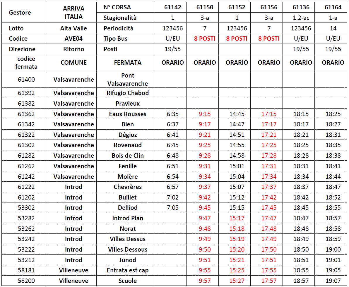 VALSAVARENCHE/VILLENEUVE (corse evidenziate in rosso effettuate con vettura 8 posti)